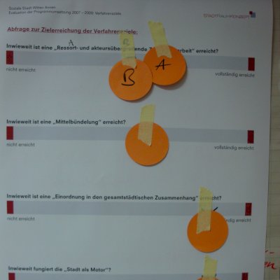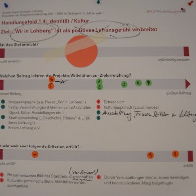 Prozessbegleitende Evaluation der Stadterneuerungsmaßnahme im letzten Jahr der Laufzeit, inklusive Herausarbeiten von Ansätzen für die Verstetigung von Strukturen. Durchführung von Akteursworkshops zur Diskussion der Zielerreichung.
